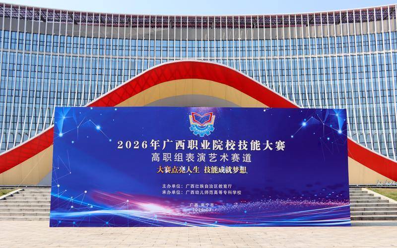 以技会友,以艺传情。为进一步推动广西职业院校人才培养模式改革,充分展示广西职业院校教育教学成果和学生风采,3月13日至15日,由自治区教育厅主办、广西幼儿师范高等专科学校(以下简称“广西幼师”)承办的2026年广西职业院校技能大赛高职组表演艺术赛道在广西幼师东盟校区艺鸣表演实践中心举行。