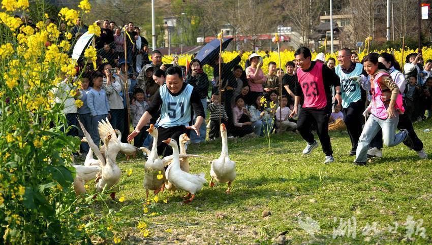 游客在油菜花海参加抓大鹅比赛。叶莉摄